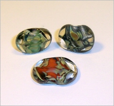 Die Muster auf den folgenden Perlen sind entweder durch das gezielte Verziehen von Fadenauflagen oder durch den punktellen Einsatz von Hitze erzeugt worden, sog. Gravity-Beads. In manchen Perlen habe ich außerdem Dense Black-Glas verwendet. Einigee der Perlen sind besonders groß, bei ihnen ist ein Maßstab angegeben.
