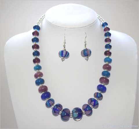 Diese Schmuckset in den Farben violett, türkis, blau habe ich in einer Woche Urlaub bei meinen Eltern angefertigt. Zunächst habe ich Perlen mit dreieckiger Verzierung versucht. Diese Farbkombination ergab wunderschöne Ergebnisse, so dass die Idee eines ganzen Schmucksets entstand. Es besteht aus einer Kette, einem Armband und einem Paar Ohrringe. Zwischen den Glasperlen habe ich Wachsperlen mit Silberüberzug verwendet. Das Armband wird einem Knebelverschluss verschlossen und kann so ohne fremde Hilfe angezogen werden.